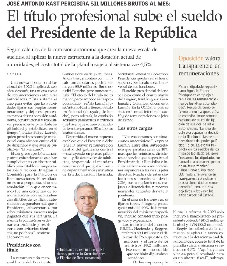 - Nota de El Mercurio: El título profesional sube el sueldo del Presidente de la República
