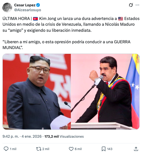 En la jornada de este lunes, se hizo viral una supuesta declaración del presidente de Corea del Norte, Kim Jong-un, en la cual habría callificado al ahora retenido mandatario de Venezuela, Nicolás Maduro, como su «amigo». Asimismo, habría advertido que su «opresión podría conducir a una Guerra Mundial».
