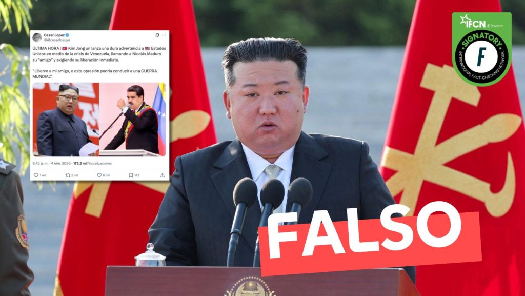 Fast Check califica el contenido como #Falso. No hay registros de que Kim Jong-un haya calificado de «amigo» a Nicolás Maduro y que advirtiera de que su «opresión» podía llevar a una Guerra Mundial. El comunicado oficial del gobieno norcoreano sobre la situación del presidente de Venezuela no lo menciona.