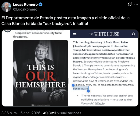 Bajo este contexto, se compartió en X la captura de una nota publicada por la Casa Blanca, donde se refiere a Latinoamérica como el «patio trasero» de Estados Unidos.