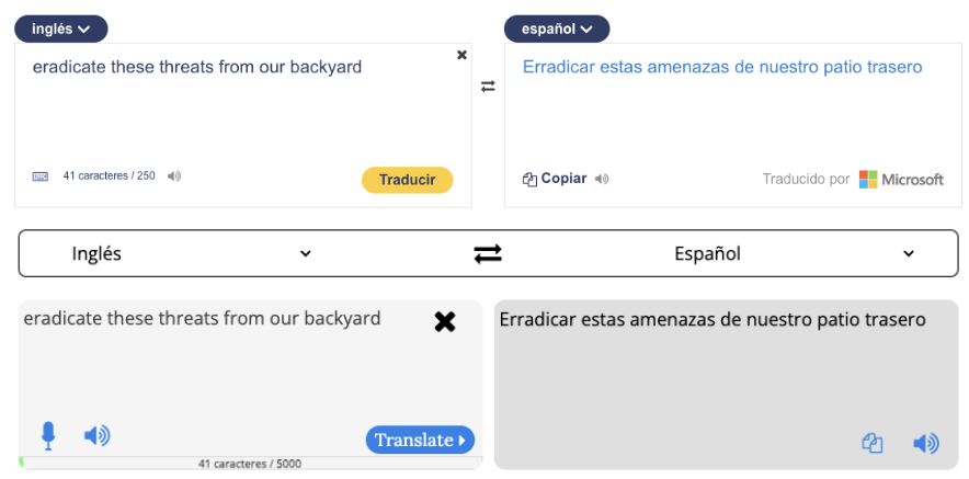 Esta última frase se tradujo la frase en cuatro distintos traductores online: Traductor de Google, Diccionario de Cambridge, Traductor de Collins y Traductor DeepL. En todos ellos el resultado fue exactamente la misma frase: «erradicar estas amenazas de nuestro patio trasero» (back: detrás/trasero; yard: patio).