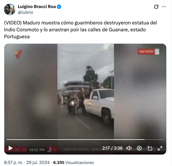 Para probarlo, el medio adjunta una serie de extractos de una transmisión en vivo de VTV, en la que Nicolás Maduro asegura que manifestantes «derriban, destruyen y luego humillan al Indio Coromoto por las calles de Guanare».