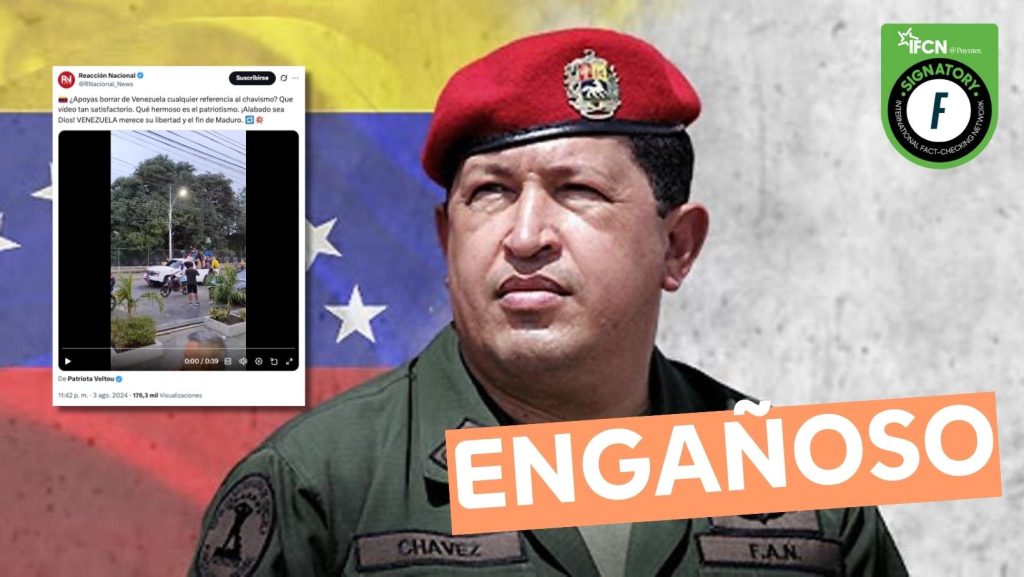 Fast Check califica este contenido como #Engañoso. Aunque es efectivo que el registro audiovisual muestra a una multitud derribando y arrastrando una estatua en Venezuela, esta no corresponde a Hugo Chávez. El monumento representaba al Cacique Coromoto y los hechos ocurrieron en julio de 2024, antes de la captura de Nicolás Maduro. En consecuencia, el contenido se difundió fuera de contexto.