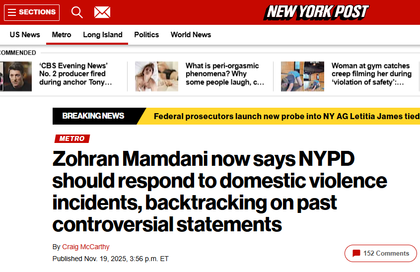 - Nota de New York Post: “Zohran Mamdani now says NYPD should respond to domestic violence incidents, backtracking on past controversial statements”