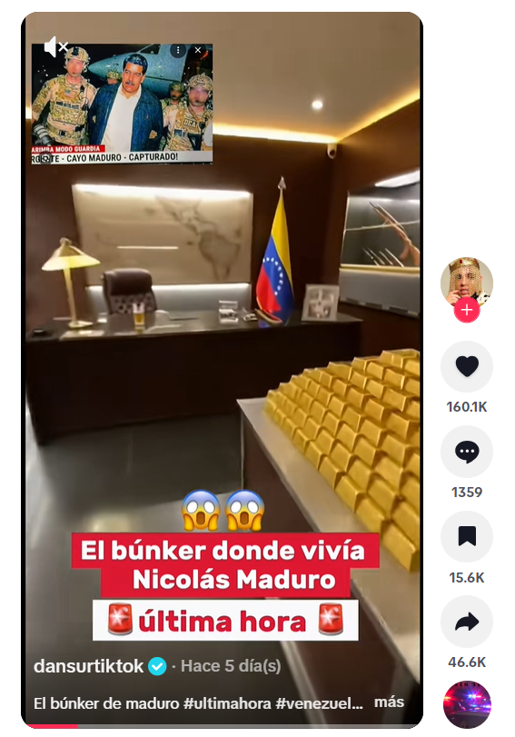 A lo largo del video, aparece una imagen en la esquina superior izquierda sobre la supuesta captura de Nicolás Maduro el 3 de enero. Dicha fotografía es falsa, Fast Check ya realizó una verificación sobre ese contenido (vea aquí).