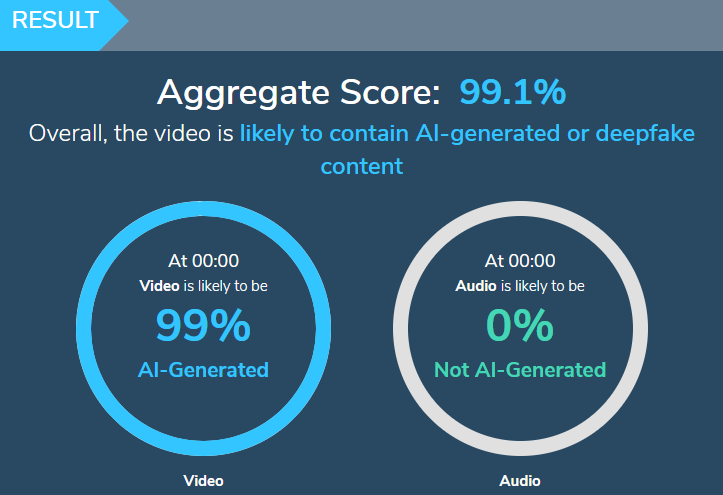 La primera herramienta llamada ‘Hive Moderation’ arrojó un 99,1% de intervención artificial a lo largo del video.