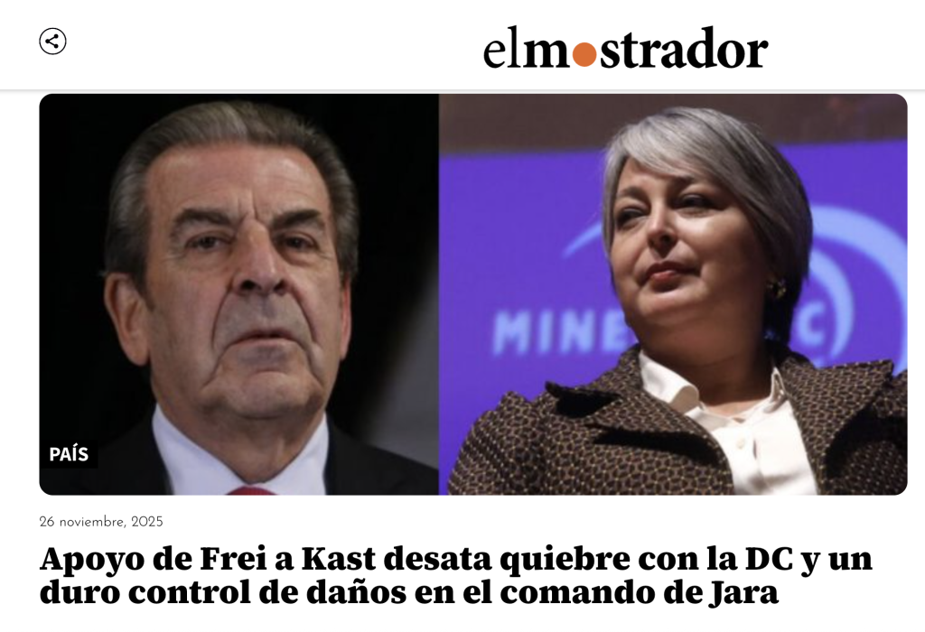 - Nota de El Mostrador: “Apoyo de Frei a Kast desata quiebre con la DC y un duro control de daños en el comando de Jara”