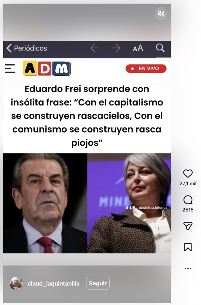 - Chequeo de Fast Check: “(Imagen) “Eduardo Frei responde: ‘A esto nos estamos enfrentando, a una ideología que no tolera a los que piensan distinto, que persiguen y censuran’”: #Falso”