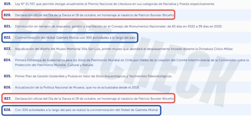 El segundo caso corresponde a las medidas 820 y 827, ambas referidas a la «declaración oficial del Día de la Danza el 19 de octubre, en homenaje al natalicio de Patricio Bunster Briceño». En la versión actual del sitio, ese avance se consigna únicamente bajo el número 822. A continuación, resaltadas en rojo, se observan ambas frases duplicadas en una captura realizada por Fast Check antes de la actualización de la plataforma.