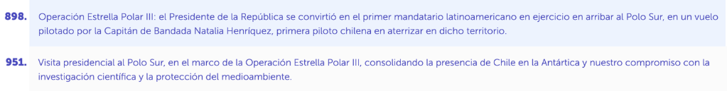 Del mismo modo, se repite el récord de exportaciones, nombrado en los avances 80 y 954, donde en ambos se resalta haber logrado envíos por más de US$107.000 millones en 2025; y la visita del presidente Boric a la Antártica, enmarcada en la Operación Estrella Polar III, mencionada en los avances 898 y 951.