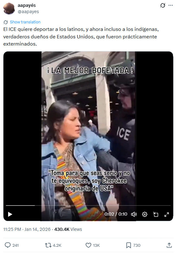 Se viralizó en la plataforma X un supuesto video donde una mujer de ascendencia indígena le propina una bofetada a un funcionario del Servicio de Control de Inmigración y Aduanas (ICE, siglas en inglés).