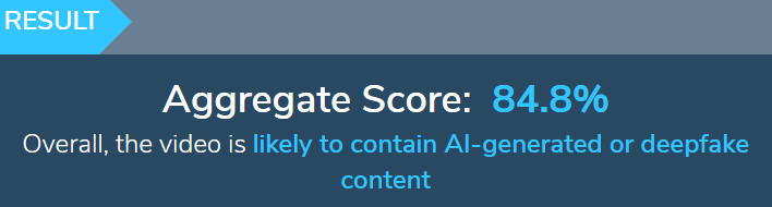 Fast Check procesó el video en la plataforma de detección artificial ‘Hive Moderation’. Dicha herramienta detectó un 84.8% de actividad sintética en el video verificado.