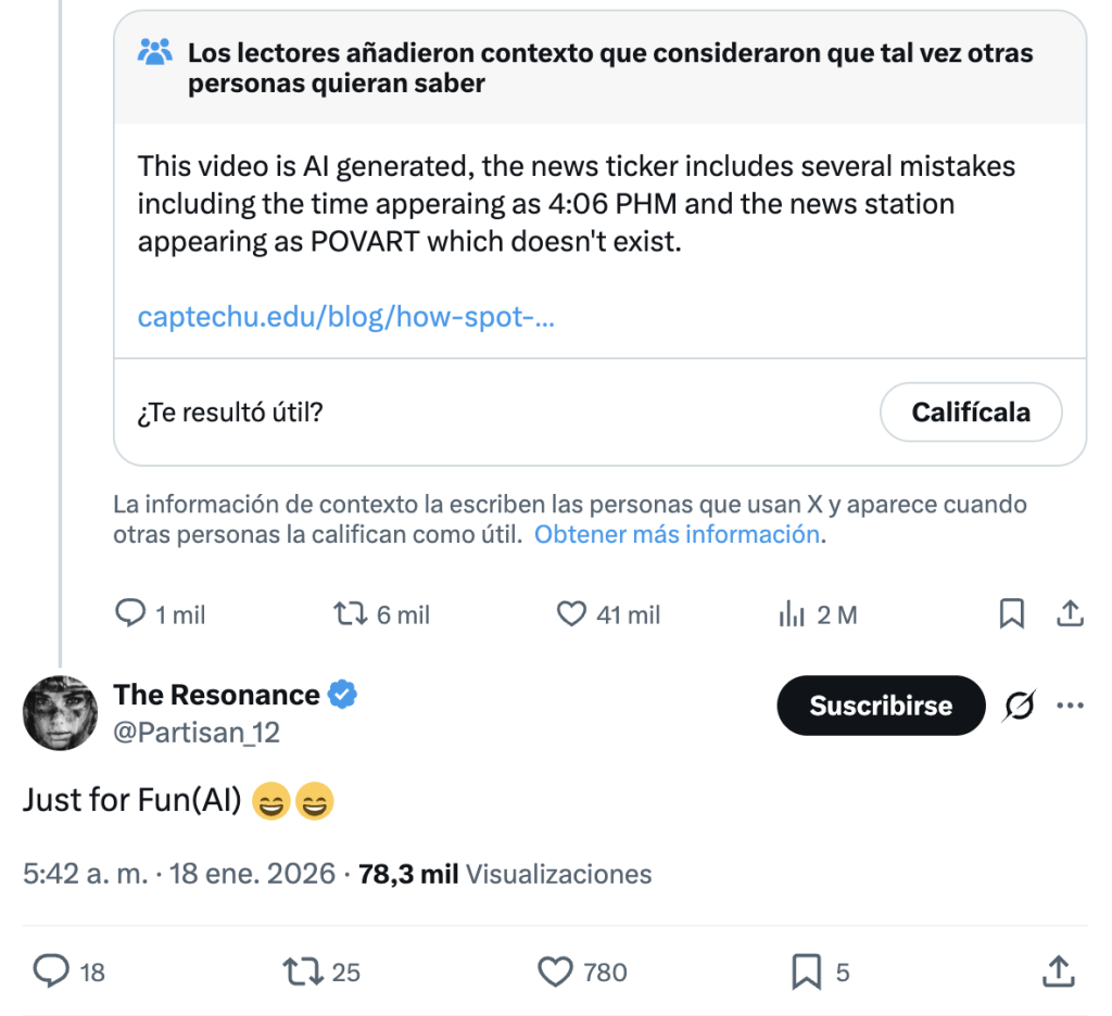 También se identifican una serie de pistas visuales que permiten llegar a la misma conclusión. Entre ellas, que los policías de ICE lucen idénticos, que la hora en el monitor aparece con siglas «PHM» y no «PM», y que el canal que supuestamente transmitió los hechos, POVART, no existe.