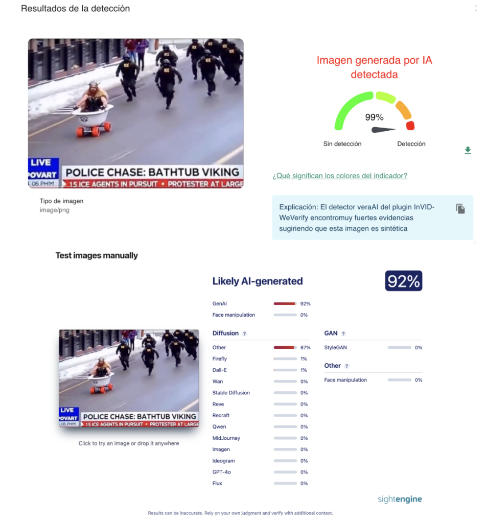Los análisis dieron positivo: motores como InVID y Sightengine indicaron que la imagen es sintética con 99% y 92% de probabilidad respectivamente.