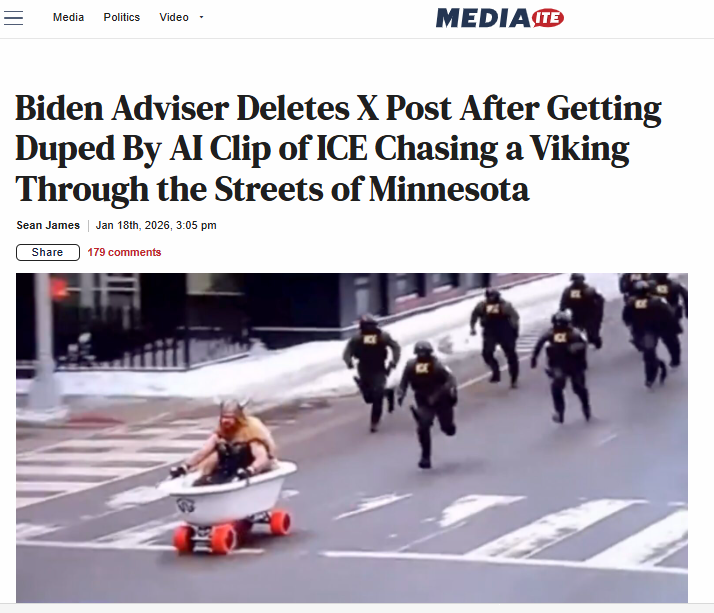 • Nota de Media ITE: “Biden Adviser Deletes X Post After Getting Duped By AI Clip of ICE Chasing a Viking Through the Streets of Minnesota”