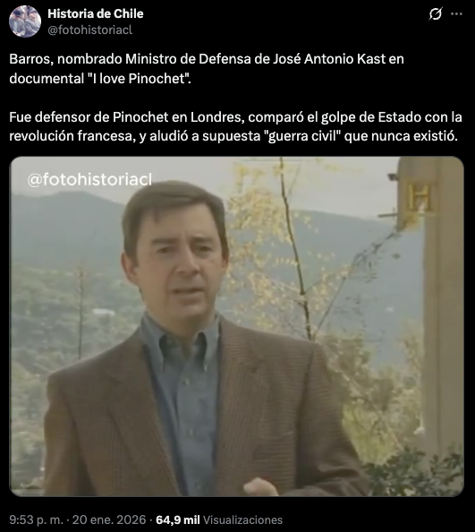 En esa misma linea, se viralizó un extracto del documental ‘I love Pinochet’ donde el próximo ministro de Defensa, Fernando Barros, compara el golpe Estado de 1973 con la revolución francesa. El autor de la publicación menciona: