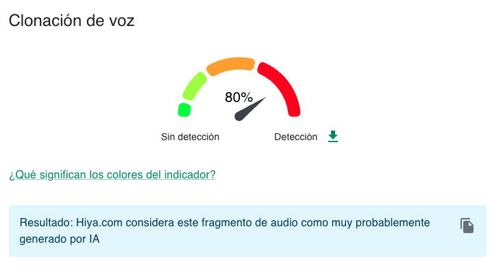 InVID (98%), Hive Moderation (69,2%)y Undetectable IA (60%) arrojaron altas probabilidades de que el contenido fuese generado con IA, o que incluya tecnología deepfake en su composición. En tanto, Hiya también mostró que la clonación de voz es altamente probable, con 80%.