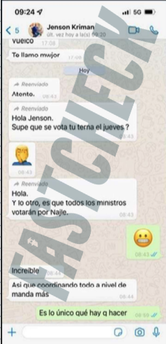 Kriman «sostiene un dialogo con otra persona, a quien le reenvía mensajes de otro diálogo, donde le avisan que su terna se votará un día jueves y que los ministros iban a votar por Najle», dice el análisis del peritaje a la captura de pantalla que, según el propio OS7, se encontraba archivada en el teléfono de Vivanco desde el 19 de abril de 2024.