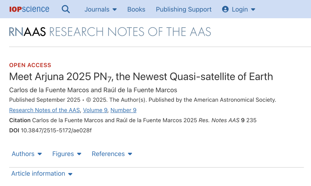 Los diarios citan un estudio que demostró la existencia del cuerpo publicado en septiembre del año pasado. Se titula «Meet Arjuna 2025 PN7, the Newest Quasi-satellite of Earth», al español, «Conoce a Arjuna 2025 PN7, el cuasi-satélite más nuevo de la Tierra».