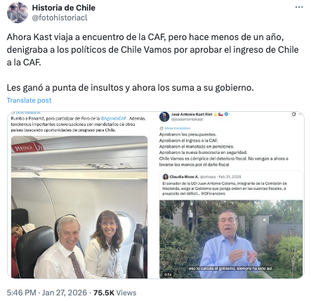Tras ello, se viralizó una publicación en la que un usuario cuestiona la participación de Kast en el evento luego de haber criticado en febrero de 2025 a parlamentarios de Chile Vamos por aprobar el ingreso de nuestro país a la CAF.