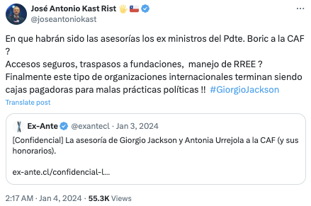 El primer caso fue en relación a asesorías que el ex ministro de Desarrollo Social, Giorgio Jackson, y la ex canciller, Antonia Urrejola, hicieron con la CAF. En esa ocasión —enero de 2024— aseguró que «este tipo de organizaciones internacionales terminan siendo cajas pagadoras para malas prácticas políticas!!».