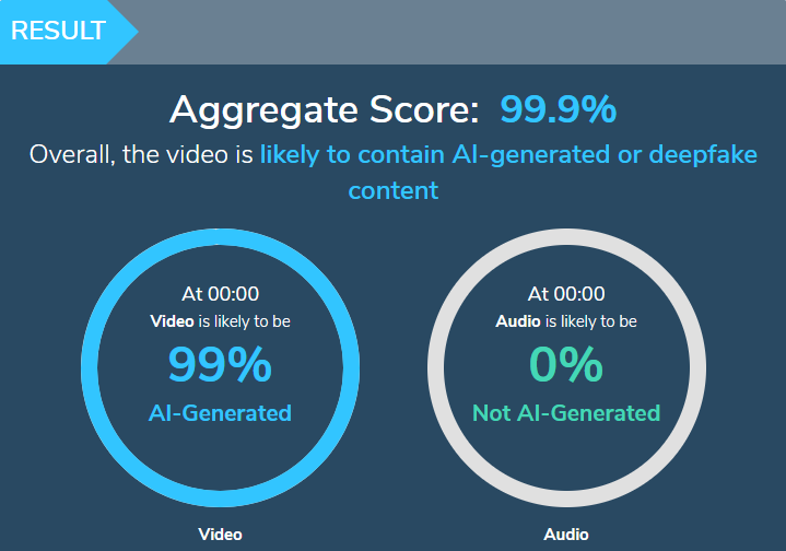 Sumado a los antecedentes mencionados, Fast Check procedió a un análisis de detección artificial con la aplicación ‘Hive Moderation’, que arrojó un 99,9% de manipulación sintética en el video verificado.