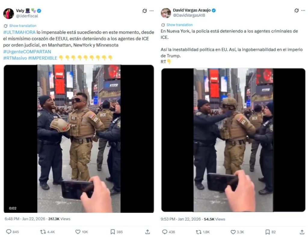 Distintas publicaciones de X (1,2) comparten un supuesto video de la policía de Nueva York deteniendo agentes del Servicio de Control de Inmigración y Aduanas (ICE, siglas en inglés). La retención sucede en pleno Times Square, epicentro neoyorquino.
