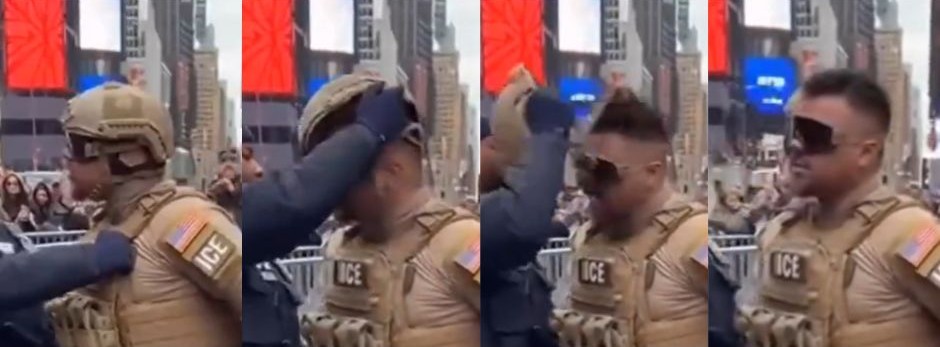 En el desarrollo del video, el policía neoyorquino retira el casco del agente del ICE. Cuando realiza la acción, no hay ningún efecto consecuente en los lentes tácticos del oficial de inmigración, se quedan en su cara sin ningún movimiento a pesar de estar cohesionado con el capacete.