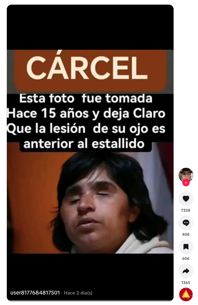 Sin embargo, el contenido viral sostiene que la foto es de «hace 15 años y deja (en) claro que la lesión de su ojo es anterior al estallido». La publicación alcanza 300 mil visualizaciones en TikTok y 69 mil en X.