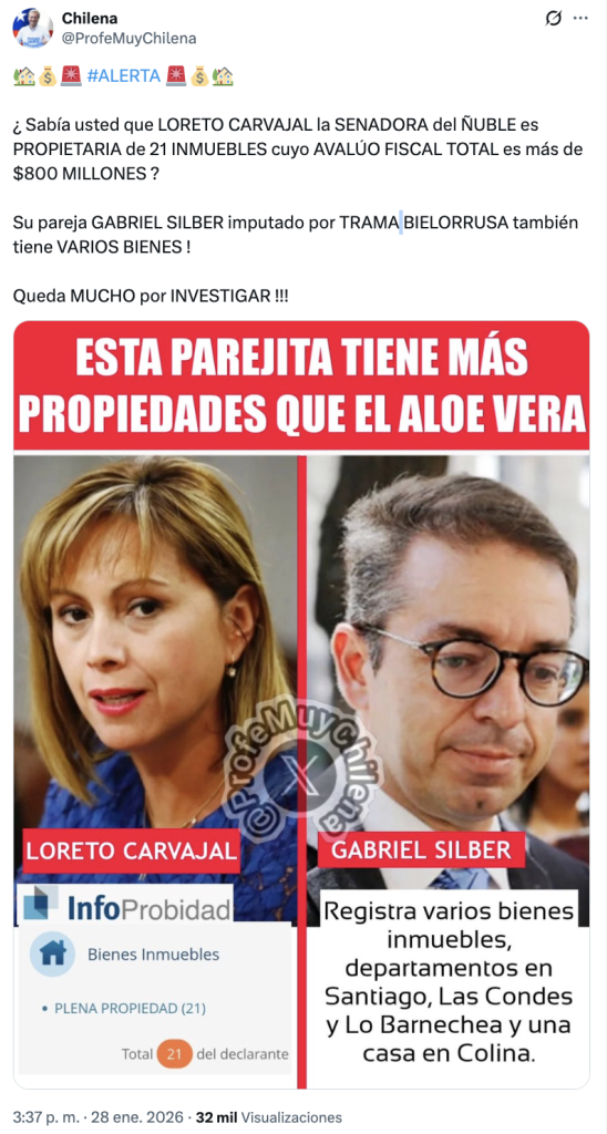 Circula en redes sociales que la senadora Loreto Carvajal (PPD) tendría 21 propiedades avaluadas en más de 800 millones de pesos. El contenido se difunde luego conocerse que la Fiscalía abrió una investigación contra ella por supuestos pagos para intervenir en el nombramiento de Yamil Najle, como conservador de bienes raíces de Chillán.