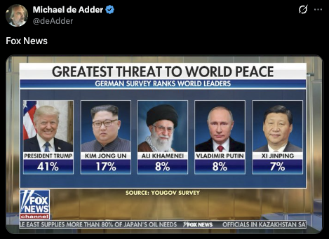 A new survey shows Germans think President Trump is a bigger threat to world peace than dictators Kim Jong Un and Vladmir Putin. pic.twitter.com/OslbTH5SBF