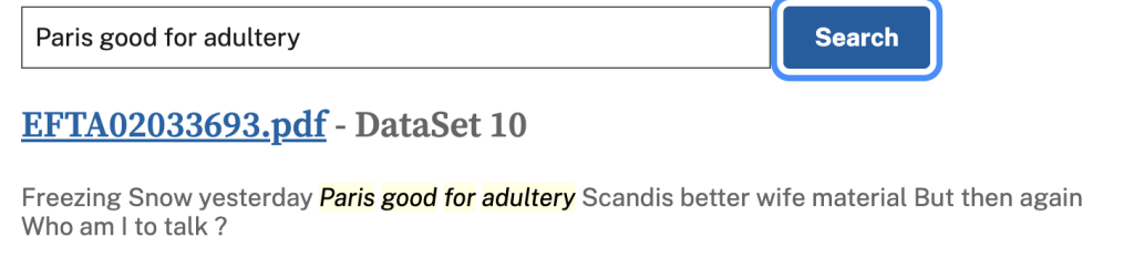 Se hizo el mismo ejercicio con un mensaje de la princesa de Noruega, Mett-Marit, al empresario pedófilo. En 2012, aconsejó a Epstein diciendo: «Paris is good for adultery» («París es bueno para el adulterio»).