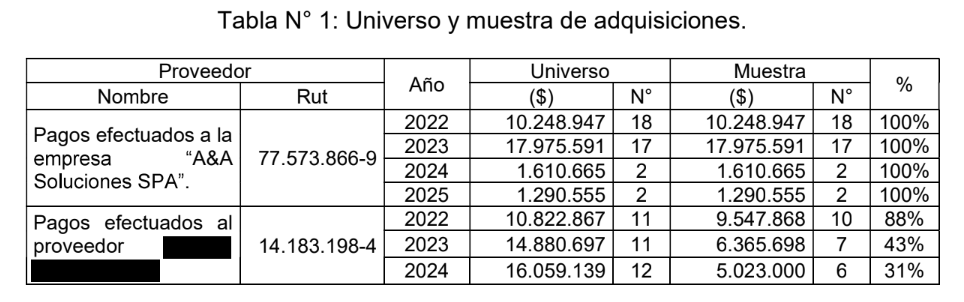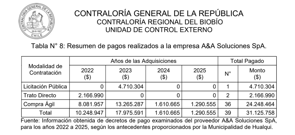 Entre las adjudicaciones observadas por Contraloría figura la empresa A&A Soluciones SpA, cuyo único propietario es el hermano de Alicia Araneda. De acuerdo con el informe, esta sociedad recibió 39 adquisiciones por parte del municipio —36 de ellas mediante la modalidad de compra ágil— entre enero de 2022 y junio de 2025. El monto total de las contrataciones supera los $31 millones.