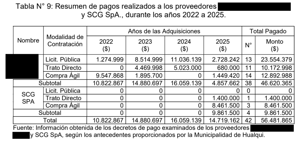 Asimismo, el informe cuestiona las compras realizadas a la empresa SCG SpA, perteneciente a un amigo cercano de Gian Rocha, quien al momento de los hechos se desempeñaba como director subrogante de Medio Ambiente. La sociedad registró órdenes de compra con la Municipalidad apenas dos días después de su constitución y, en total, recibió pagos por un monto superior a los $9 millones. A ello se suman transferencias por más de $46 millones cursadas al amigo de Rocha en su calidad de proveedor individual.