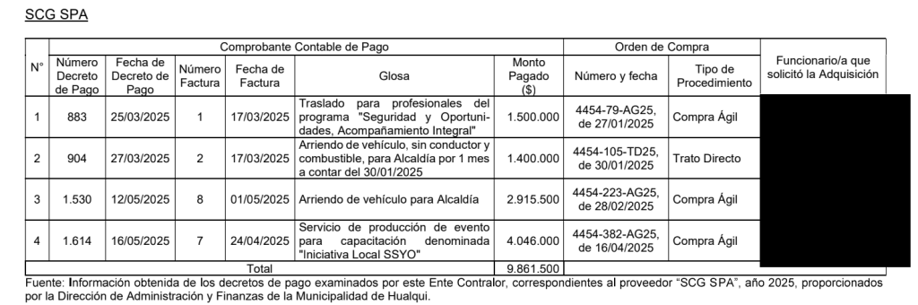 En menos de cinco días desde su creación el 25 de enero de 2025, la empresa SCG SpA recibió dos órdenes de compra por parte de la Municipalidad de Hualqui. Las contrataciones —correspondientes a una compra ágil por $1.500.000 y un trato directo por $1.400.000— fueron aceptadas por el municipio los días 27 y 30 de enero respectivamente.
