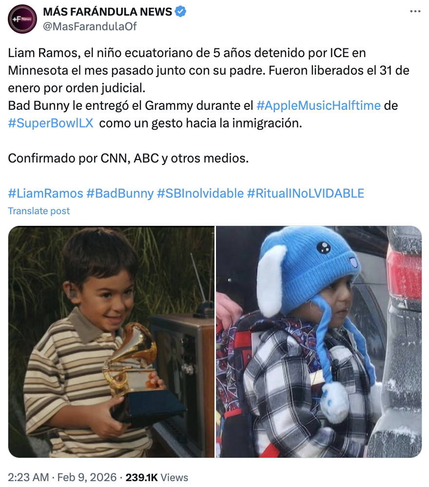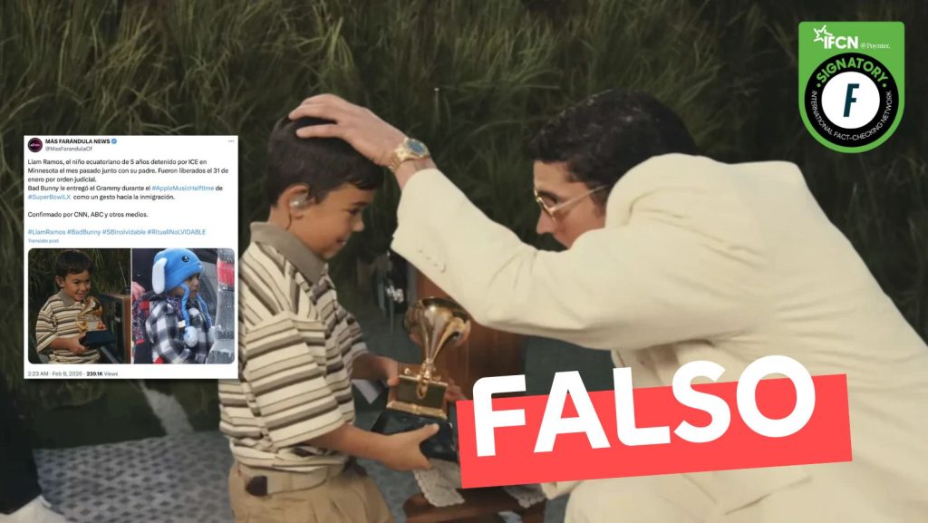 Fast Check califica el contenido como #Falso. El niño al que Bad Bunny entregó su premio Grammy durante su presentación en el Super Bowl no era Liam Ramos —niño detenido por el ICE en enero—, sino el joven actor Lincoln Fox. Además, el propio Fox aclaró la situación a través de Instagram.