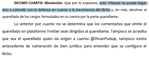 Lo anterior por cuanto no se determina que los comentarios que emite el querellado en plataforma Twitter sean dirigidos al querellante. Tampoco se acredita que sea el querellado quien da origen a cuenta @DivanPoduje, tampoco existe antecedente de vulneración de bien jurídico para entender que se configura el ilícito.