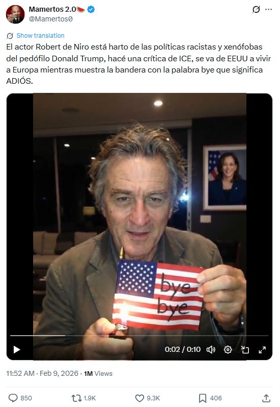 En la publicación verificada, el autor afirma que el actor Robert De Niro realizó esta acción motivado por su rechazo a las políticas de Donald Trump. Sin embargo, tal como se ha demostrado en este y otros análisis de verificación, dicha premisa se sustenta en un registro audiovisual generado mediante inteligencia artificial.