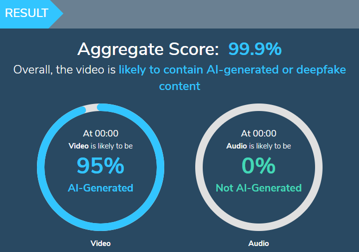 Con todos los antecedentes visuales, el video se examinó mediante la plataforma de detección artificial ‘Hive Moderation‘. La herramienta determinó con un 99.9% de certeza que el video fue creado con inteligencia artificial.