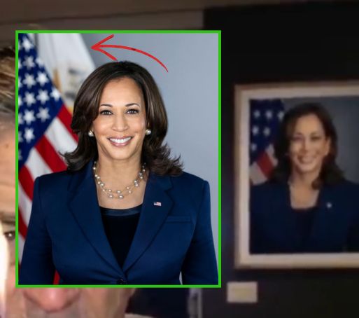 En la fotografía oficial, Harris luce aretes y un collar de perlas claramente definidos, además de distinguirse una bandera blanca junto al pabellón estadounidense en el fondo. Por el contrario, en el marco del video estos elementos desaparecen o se fusionan en manchas indefinidas.