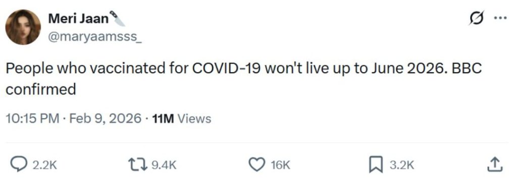«People who vaccinated for COVID-19 won’t live up to June 2026. BBC confirmed» («Las personas que se vacunaron contra el COVID-19 no vivirán más allá de junio de 2026. BBC lo confirmó»)