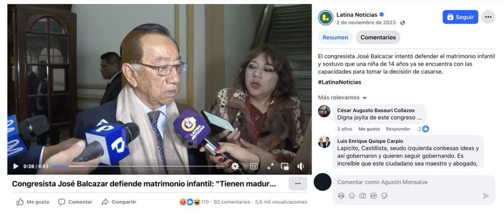 El medio local 24 Horas hizo hincapie en este aspecto, reproduciendo un clip de las declaraciones de Balcázar sobre su apoyo al matrimonio infantil. Los mismos dichos son los que reflotaron, este jueves, en redes sociales.