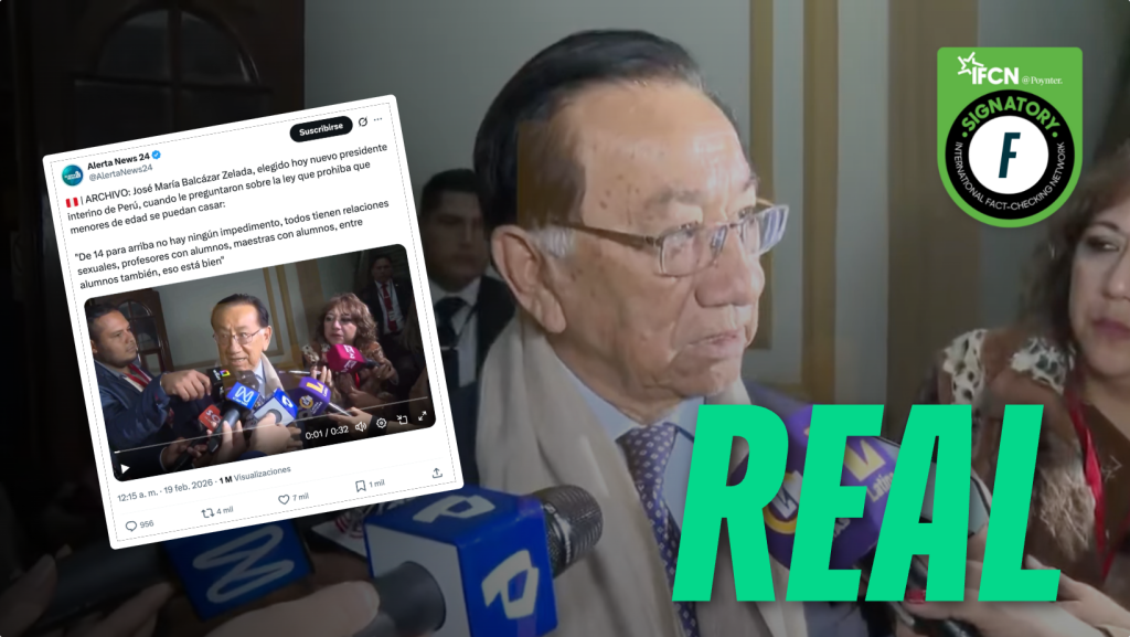 Se difunde en redes sociales un video del nuevo presidente interino de Perú, José Balcázar, afirmando que «de 14 para arriba no hay ningún impedimento» para el matrimonio infantil. Fast Check califica esto como #Real. El congresista emitió dicha declaración en 2023, cuando se tramitaba un proyecto que buscaba prohibir las uniones maritales a menores de edad.