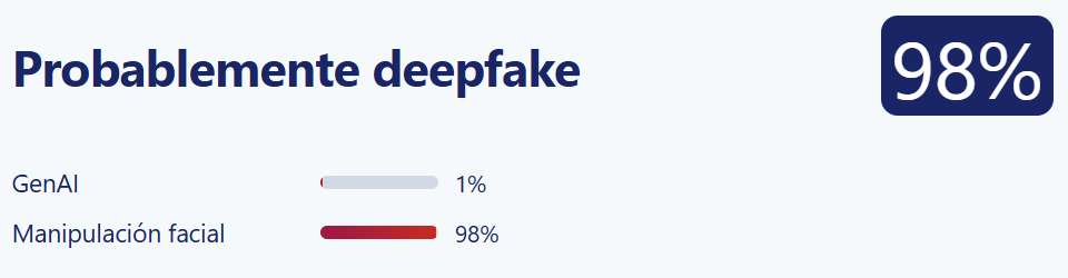 Luego, la herramienta SightEngine arrojó un 98% de probabilidad de que la imagen fuera manipulada artificialmente, especificando, una «manipulación facial».