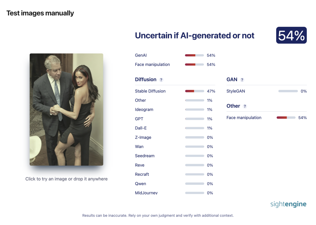 - Nota de Maldita.es: “No, esta imagen del ex príncipe Andrés de Inglaterra agarrando de la cintura a Meghan Markle no es real: está generada con inteligencia artificial”