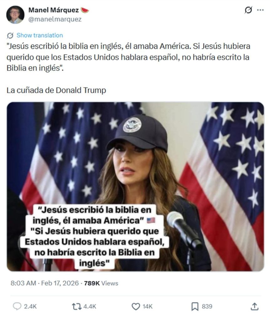 «Jesús escribió la biblia en inglés (…) Si Jesús hubiese querido que Estados Unidos hablara español, no hubiese escrito la biblia en inglés»