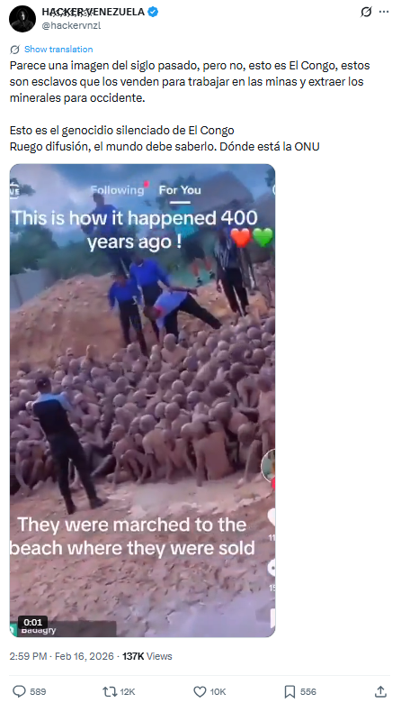 De acuerdo con la descripción que acompaña al video, se trataría de un grupo de esclavos en la República Democrática del Congo, presuntamente vendidos para trabajos forzados en minas cuyos minerales se exportan al Occidente. La publicación añade: