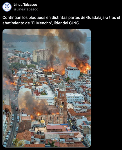 Producto del abatimiento del líder narcotraficante del Cartel Jalisco Nueva Generación (CJNG), Nemesio Oseguera Cervantes —conocido como ‘El Mencho‘—, se viralizó una imagen aérea (1,2,3) de supuestos incendios en Puerto Vallarta, Jalisco.