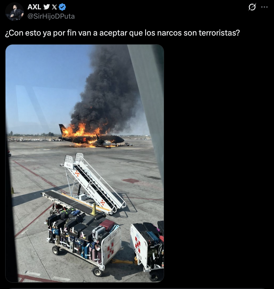 En ese contexto, se compartió la imagen (1,2) de un avión incendiándose en un aeropuerto de Jalisco. «¿Con esto ya por fin van a aceptar que los narcos son terroristas?», cuestiona uno de los usuarios que compartió el registro, cuya publicación acumula casi 3 millones de visualizaciones.