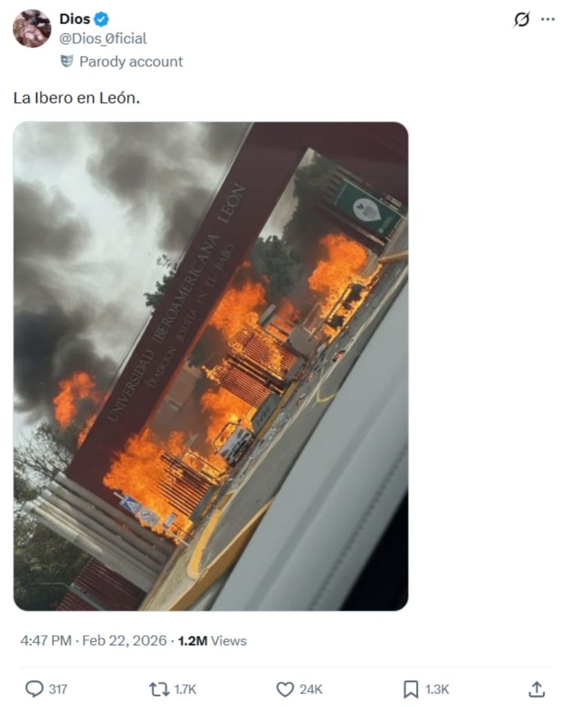En redes sociales circula una imagen (1,2) que muestran un supuesto incendio en la Universidad Iberoamericana Le贸n, presuntamente ocurrido tras la muerte de Nemesio Oseguera Cervantes, alias 芦El Mencho禄, l铆der del narcotr谩fico mexicano.